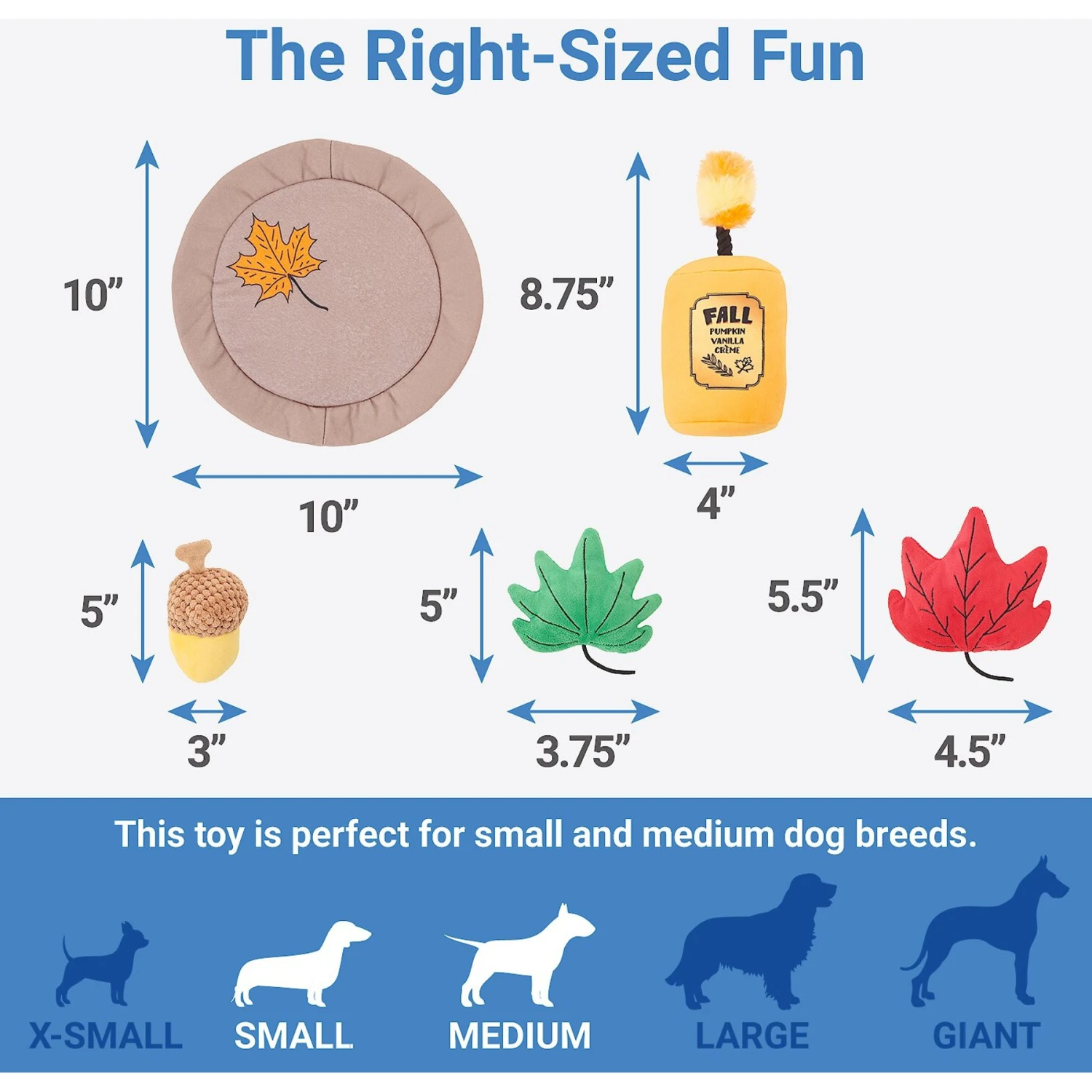 - Features squeakers in the candle and acorn toys and crinkle paper in the leaves.