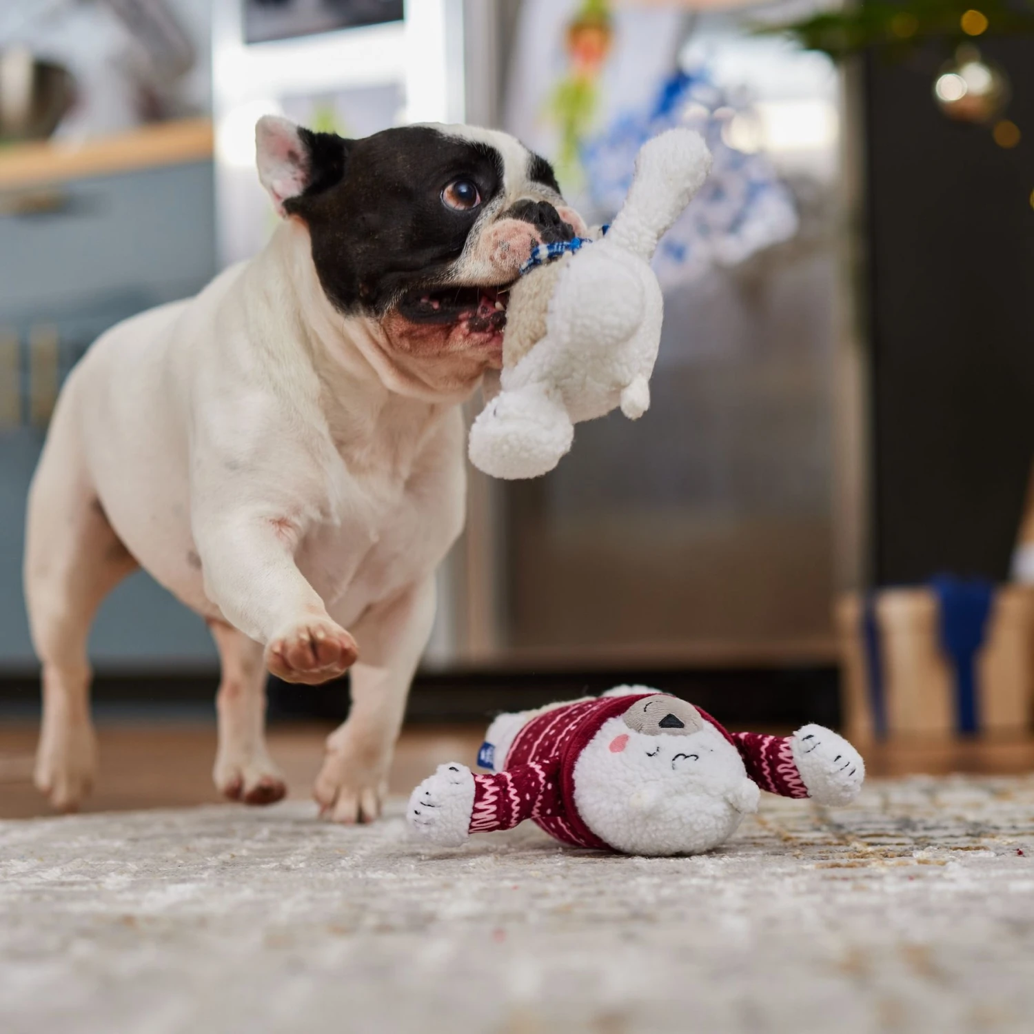 - Bring the cheer of the holiday season to your dog with these friendly plush polar bear toys. Every play session is about to level up, thanks to the squeaker thatβs found inside.